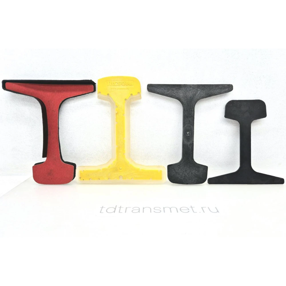 Прокладки по конфигурации имеют форму сечения рельса и выполнены методом литья под давлением в виде плоской детали из различных материалов: полиэтилена, полиамида, стеклотекстолита, фибры.