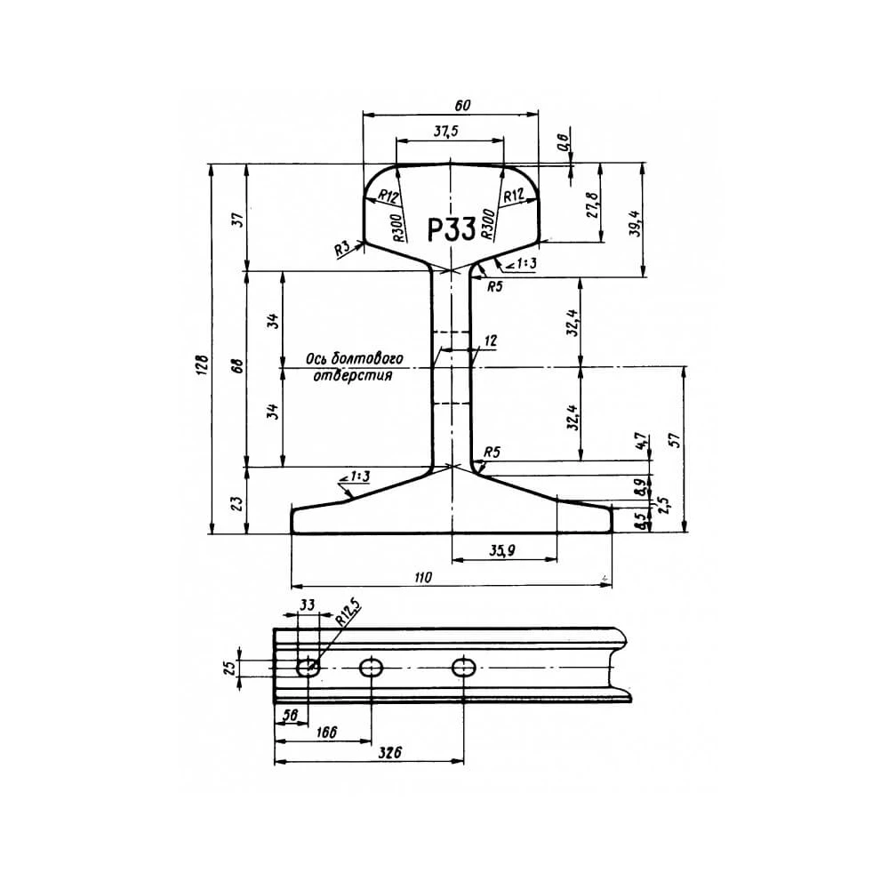 Рельсовый металлопрокат типа Р33 производится в соответствии с ТУ 14-2Р-383-2004, который определяет изделие как рельс рудничный для шахтных проводников, укладываемый на деревянные шпалы. Высота прокатного изделия составляет 128 мм., ширина подошвы 110 мм., толщина шейки 12 мм., ширина головки 60 мм. Железнодорожный рельс Р33 отпускается клиентам в зависимости от тоннажа приобретаемой партии проката, принимая во внимание, что вес одного погонного метра равен 33,42 кг. Наиболее распространенная мерная длина фасонного металлопроката Р33 – 8 метров, что эквивалентно 267,36 кг. При необходимости у нас можно заказать изделия немерной длины – от 6 метров, а также выполнить любую дополнительную обработку изделия (сверление, резку и пр.)